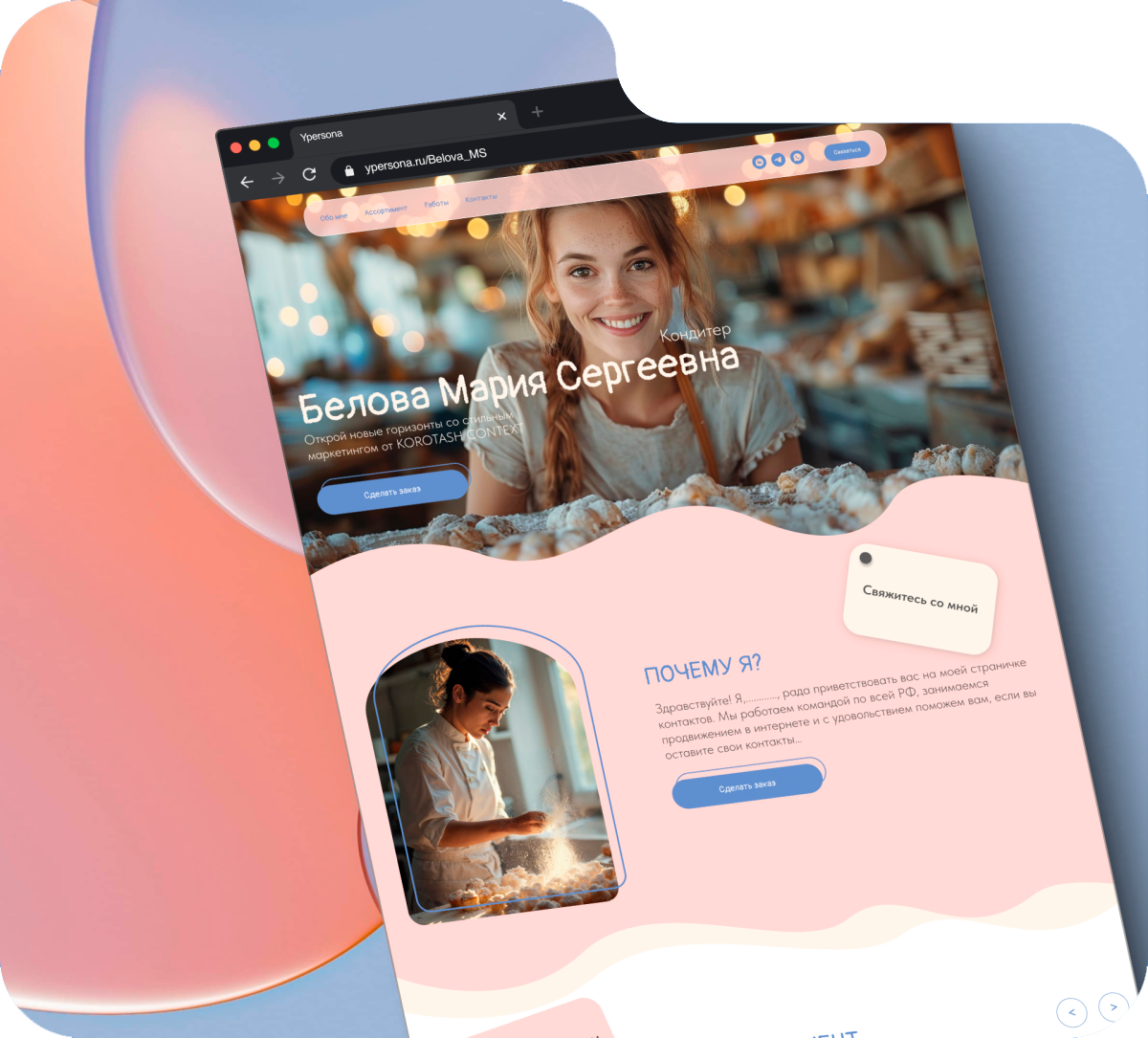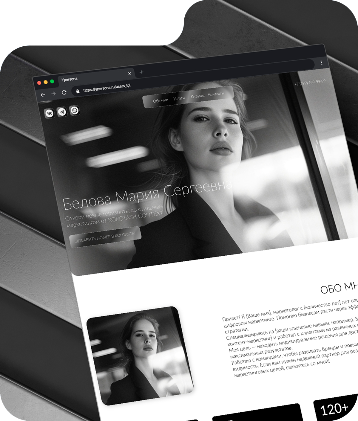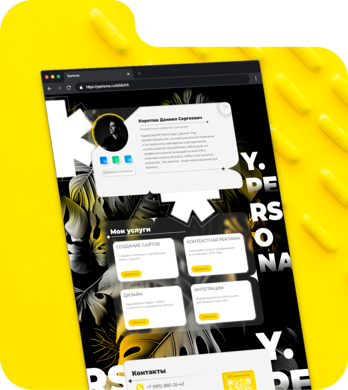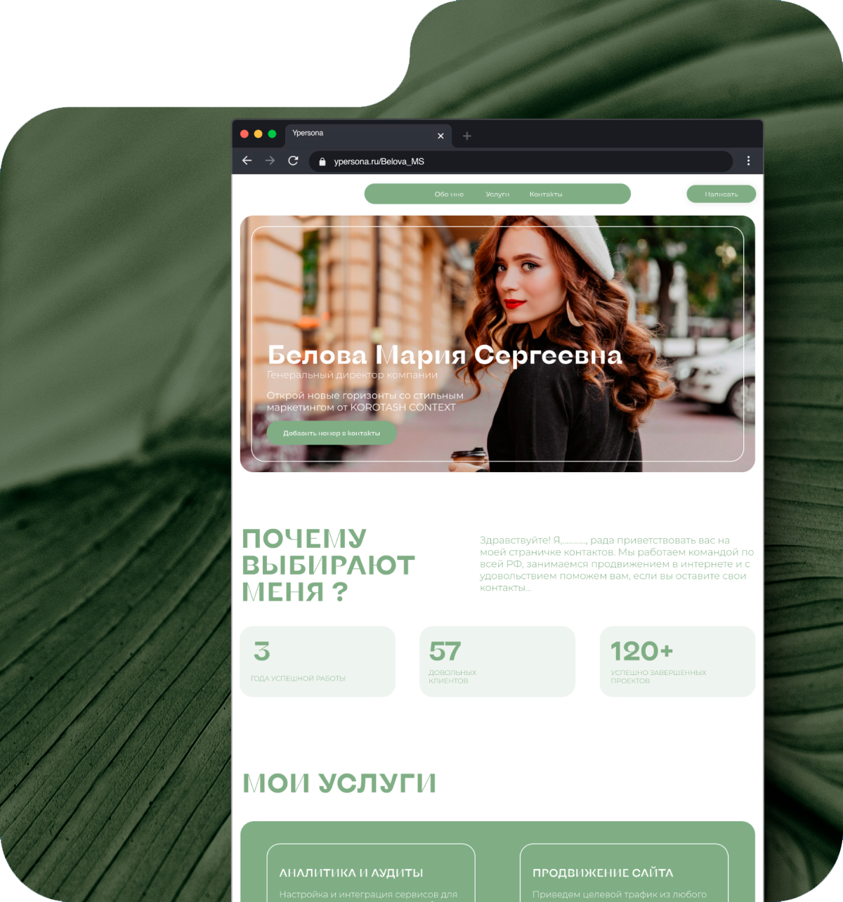 Главный блок с информацией о себе / Блок с услугами / Контактные данные